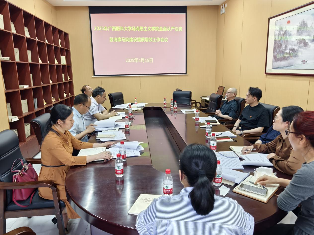 会上,陈会方传达了学校2025年全面从严治党暨清廉医大建设提质增效工作会议精神,并从党中央、自治区、全区教育系统、学校和学院等几个层面对当前面临的新形势、新要求和存在的问题进行深入分析,并部署了2025年学院全面从严治党和清廉马院建设重点工作。