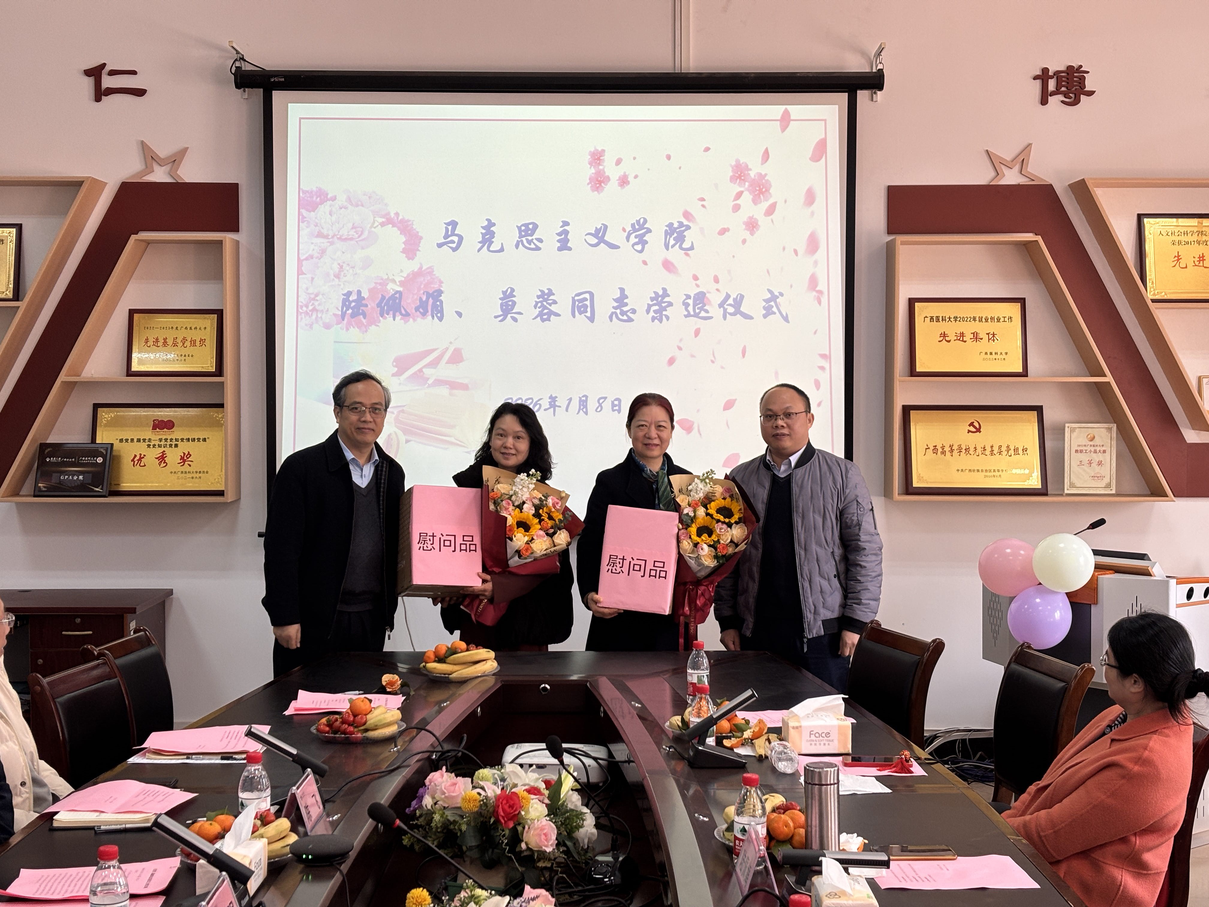 仪式上,学院院长王前强高度肯定了陆佩娟和莫蓉两位同志多年来为学院发展和教育事业所做出的卓越贡献,对她们兢兢业业、无私奉献的工作态度表达了深深的敬意,同时也对她们未来的退休生活送上了美好的祝愿。